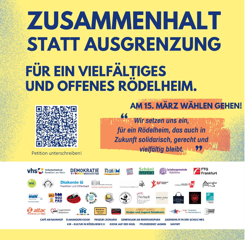 Deshalb bitten wir alle Rödelheimer*innen: Gehen Sie wählen – und stärken Sie bei den Wahlen zur Stadtverordnetenversammlung, den Ortsbeiräten und zur Kommunalen Ausländer- und Ausländerinnenvertretung am 15. März 2026 in Frankfurt diejenigen Parteien, die sich für Vielfalt, Zusammenhalt und soziale Gerechtigkeit einsetzen.